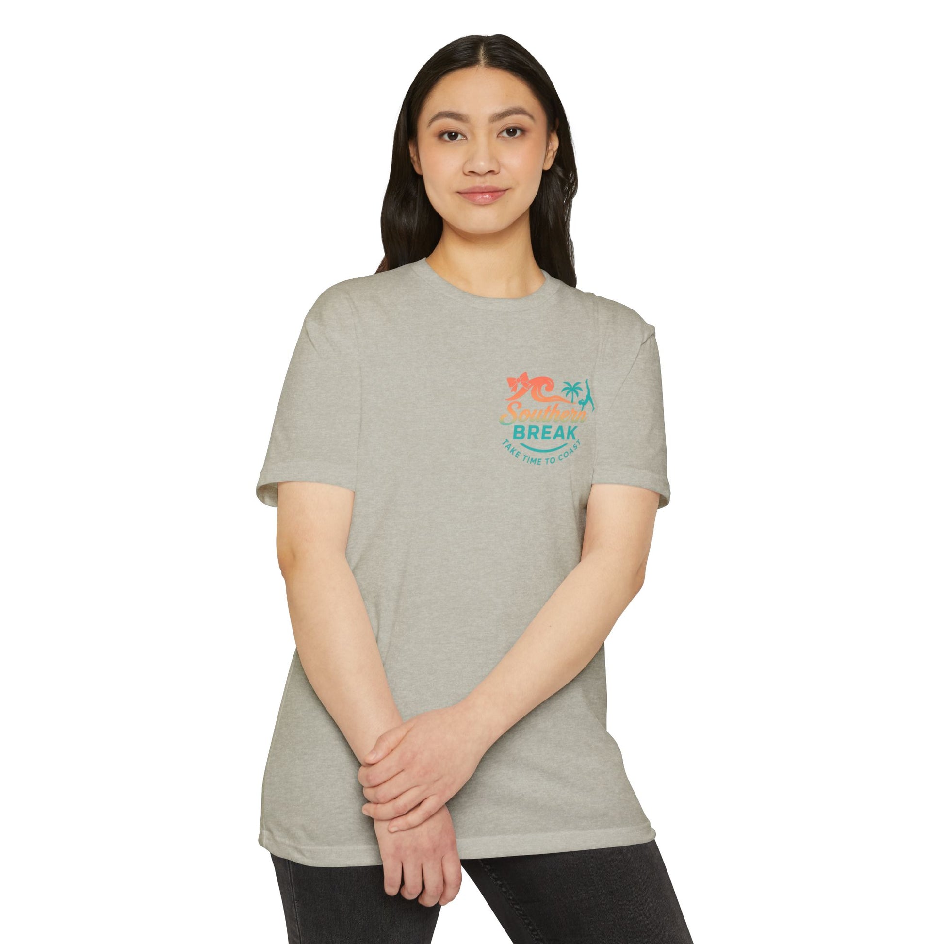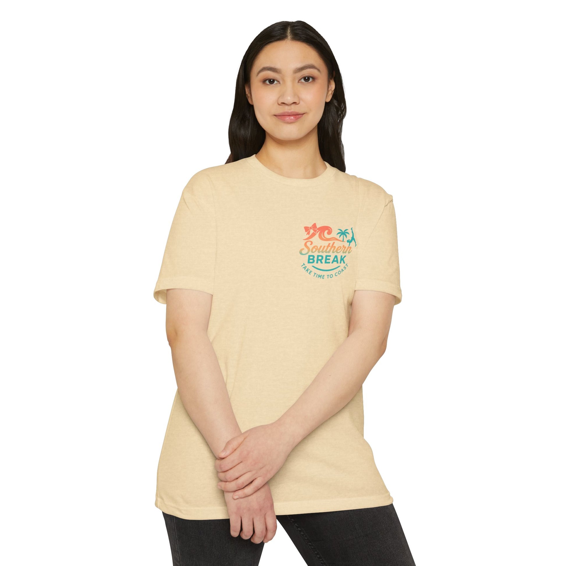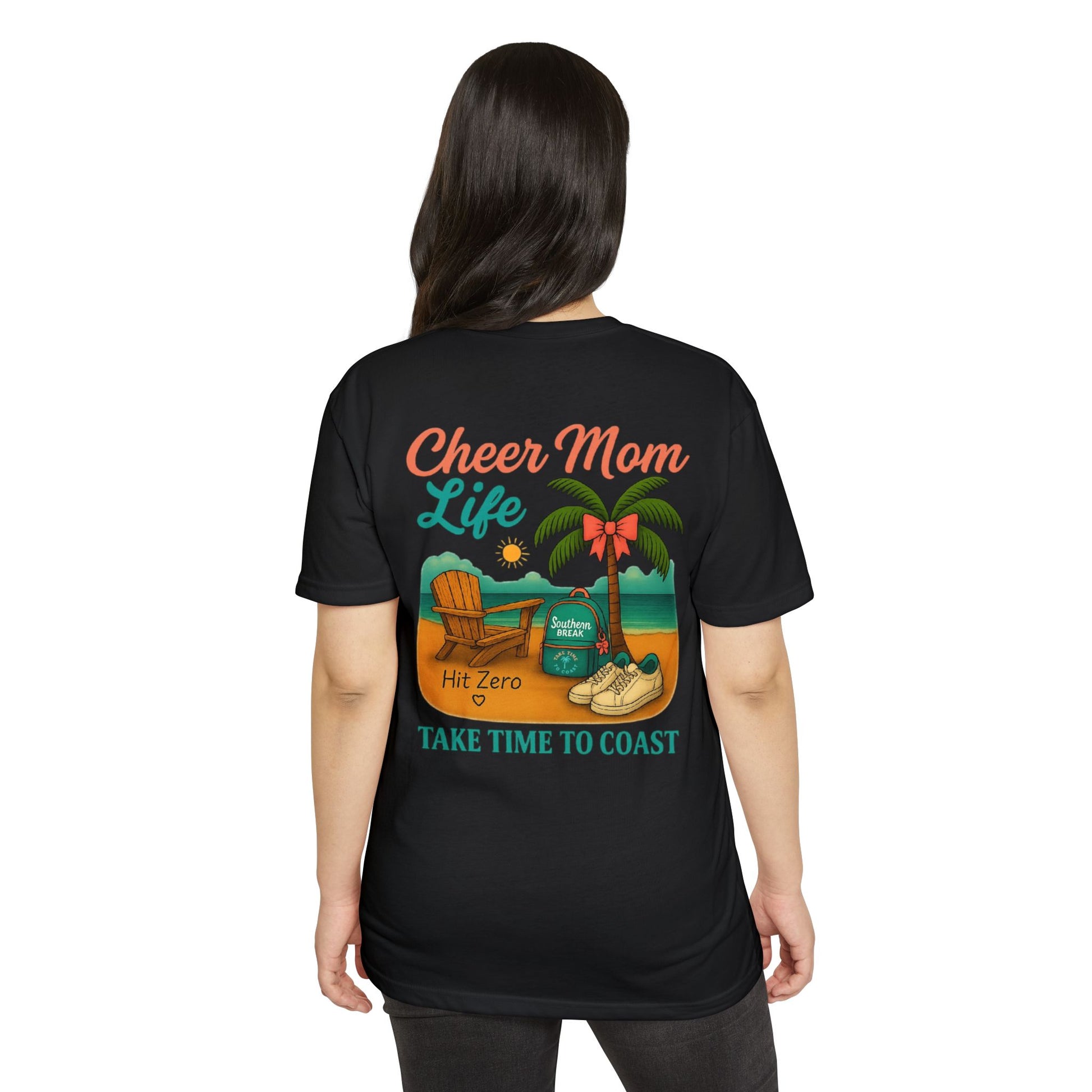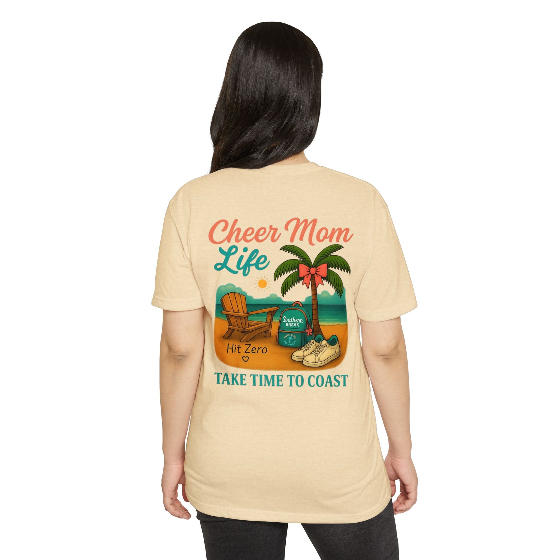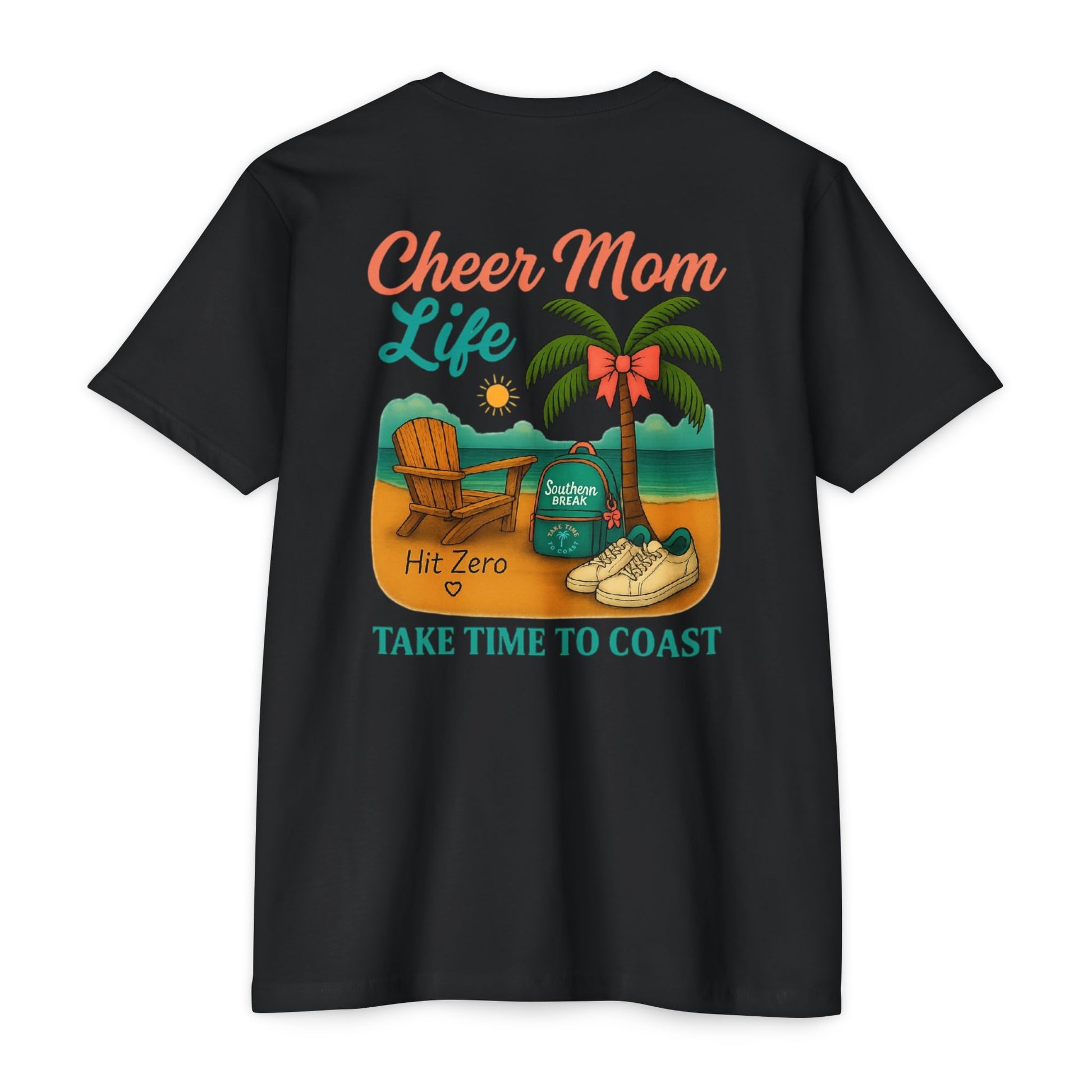 Celebrate the best of both worlds — the cheer life and the coastal life — with this vibrant Cheer Mom Life graphic tee. Featuring a beachside scene with an Adirondack chair, palm tree tied with a coral bow, sneakers, and a teal backpack with the Southern Break logo, this design captures the spirit of cheer moms who “Hit Zero” and still take time to relax. The slogan Take Time to Coast ties it all together, reminding you to enjoy the journey.