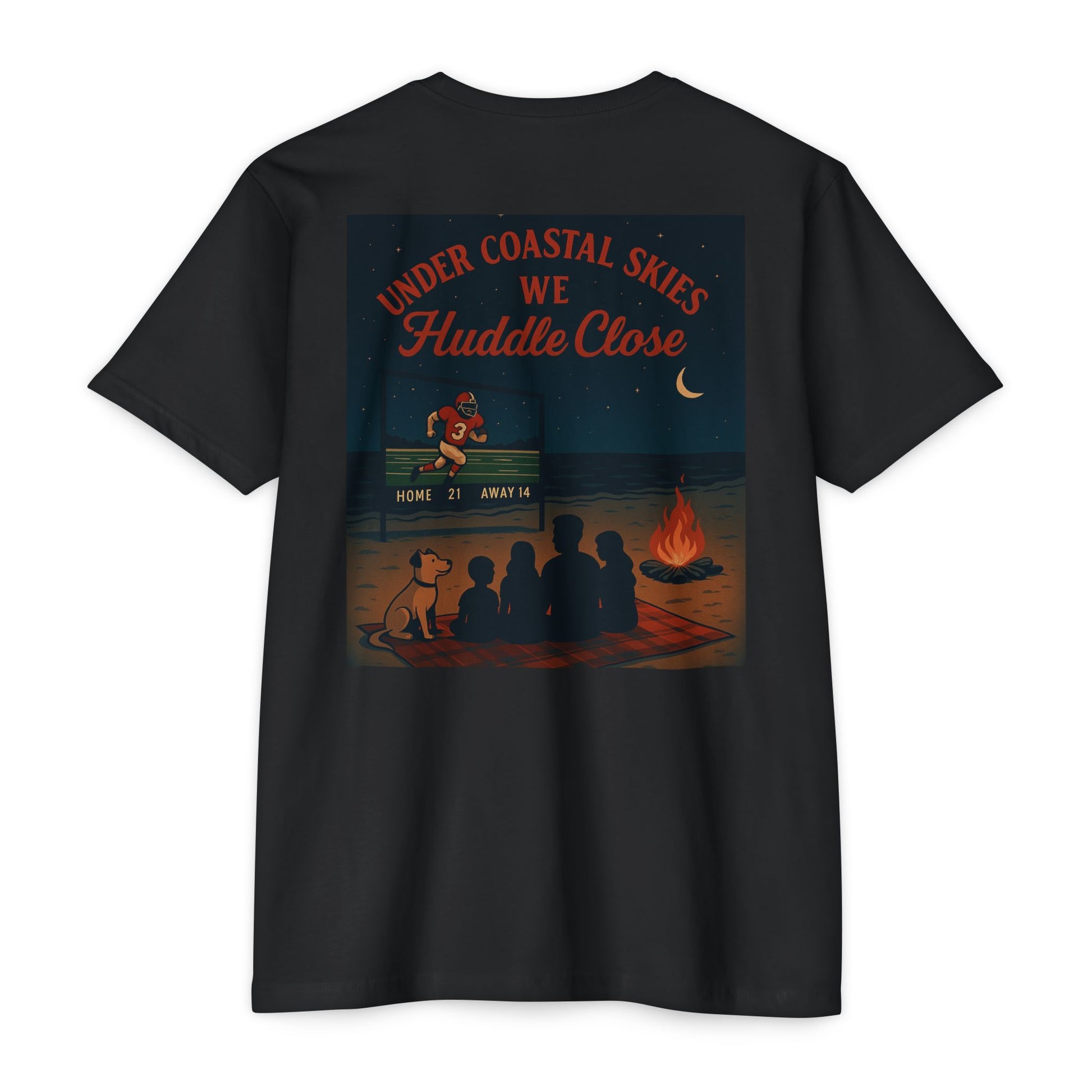 Flip it over, and the story continues: a powerful back graphic of Nate, Sara, Ryelee, and Jayden sitting together with their dog on the beach, huddled by a fire, watching football under the night sky. Above it reads “Under Coastal Skies We Huddle Close” — a tribute to family, tradition, and the heartbeat of Southern Break.