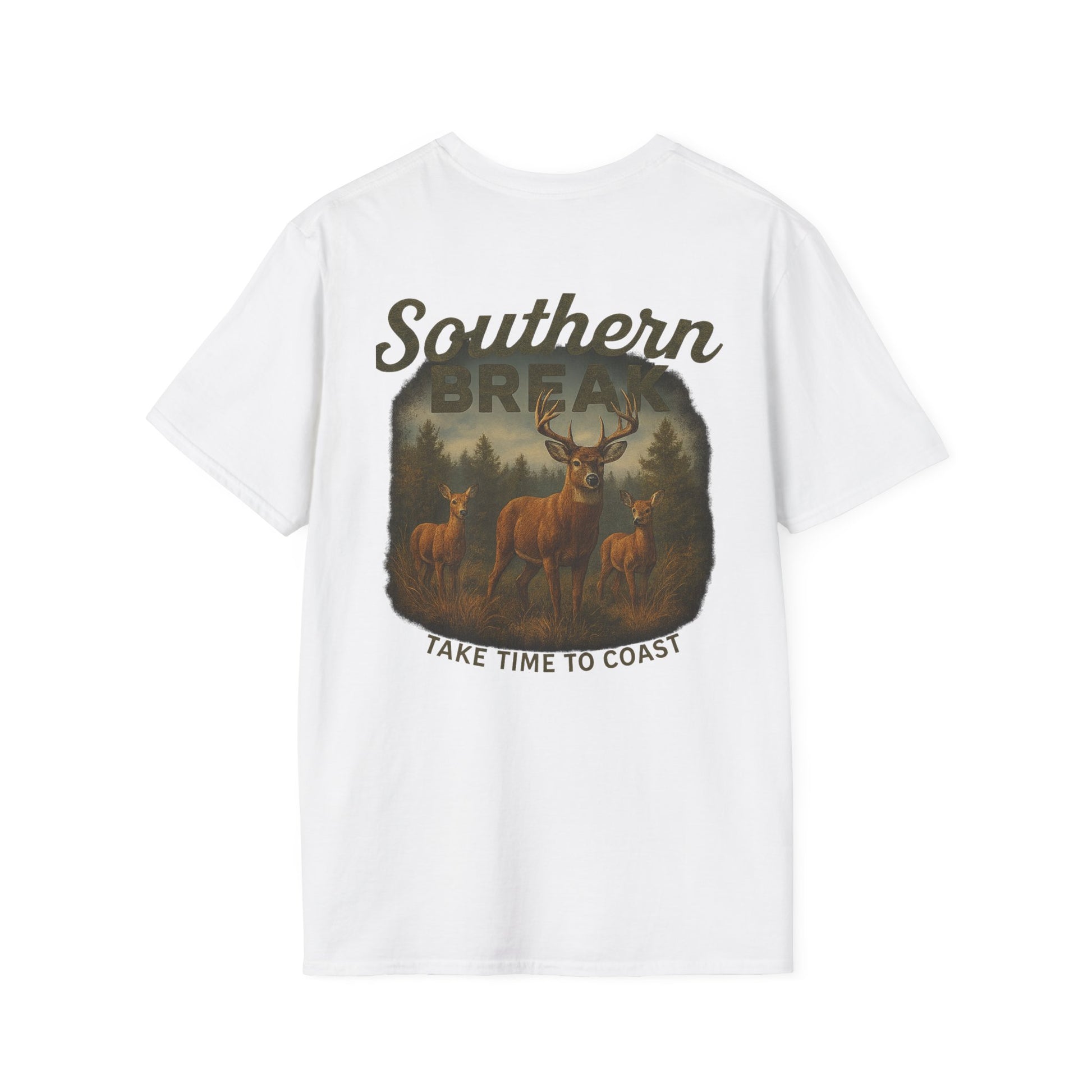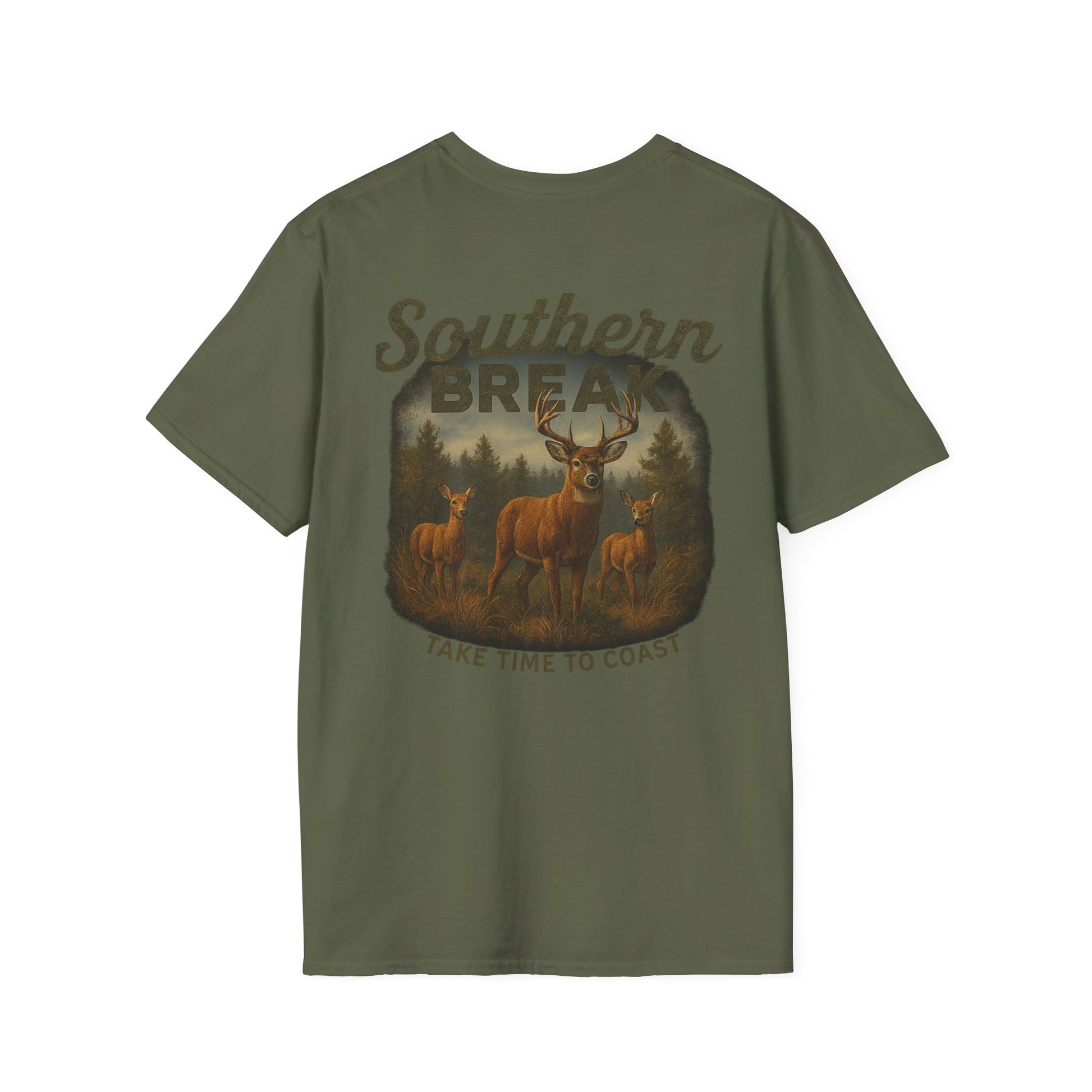 Bring the hunt and the coast together with the Southern Break “Deer Woods” Tee. This shirt features a bold back graphic of three deer in a woodland scene. Highlighted by a majestic buck with a heavy rack — framed under the Southern BREAK name in our signature Georgia Woods Camo. The design fades naturally into the shirt with no harsh borders, keeping that classic outdoor vibe.