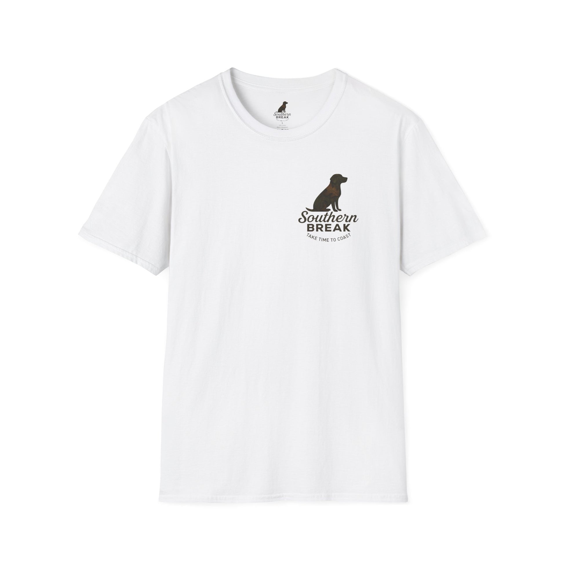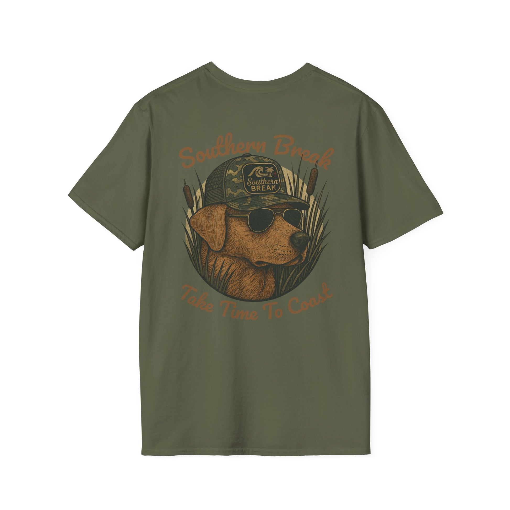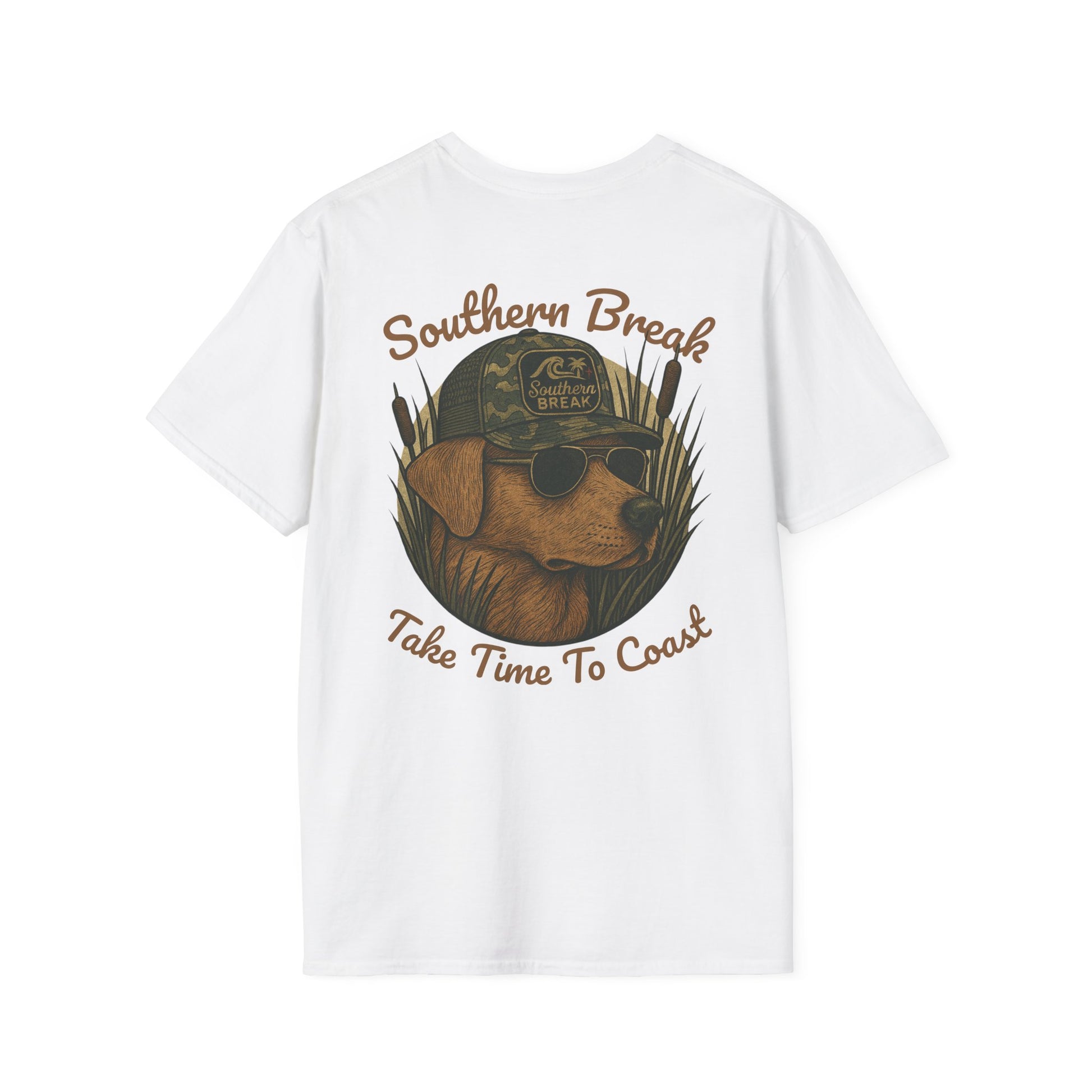 Keep your eyes on the coast with the SB Southern Line Lookout Dog Tee. This design features a loyal retriever rocking aviator shades and a camo Southern Break cap, peeking through the marsh grass with cattails in view. Detailed vintage-style linework and warm golden-brown tones give this graphic a rugged yet coastal feel, finished with our Southern Break script and slogan “Take Time To Coast.”