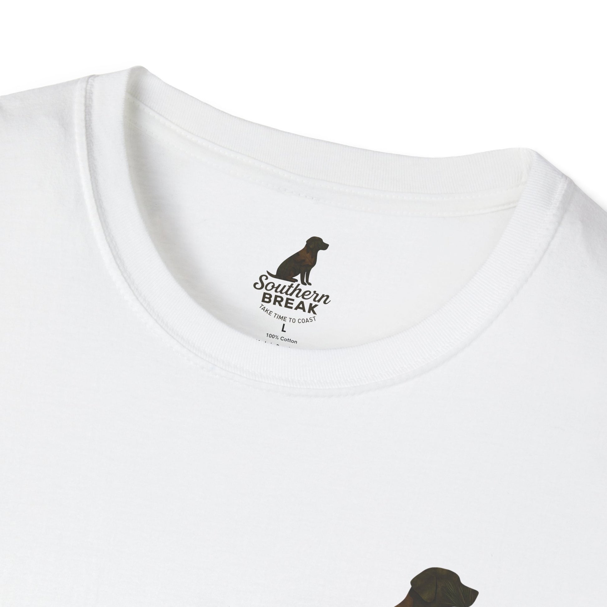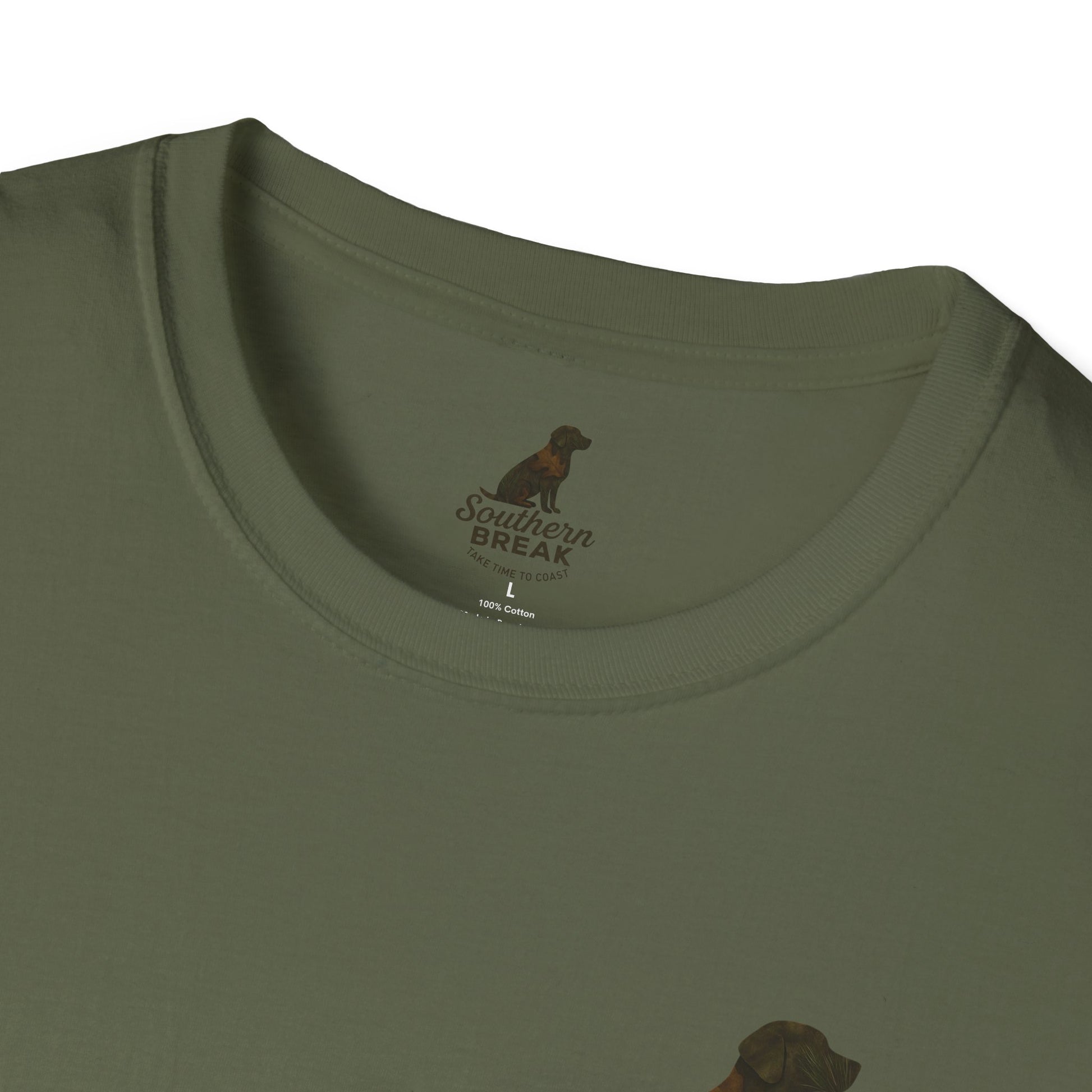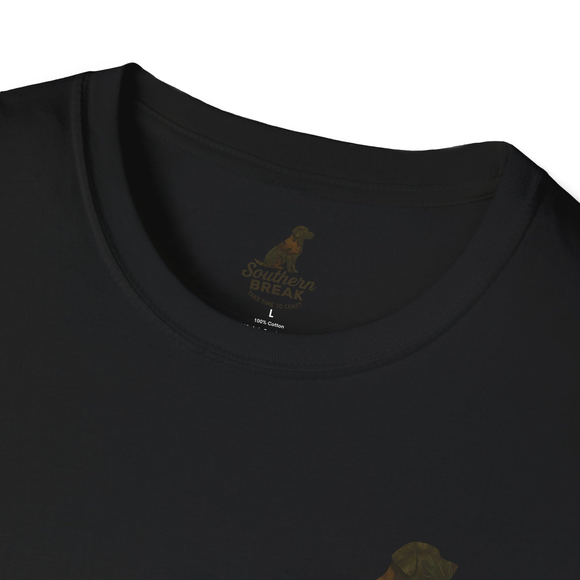 Keep your eyes on the coast with the SB Southern Line Lookout Dog Tee. This design features a loyal retriever rocking aviator shades and a camo Southern Break cap, peeking through the marsh grass with cattails in view. Detailed vintage-style linework and warm golden-brown tones give this graphic a rugged yet coastal feel, finished with our Southern Break script and slogan “Take Time To Coast.”