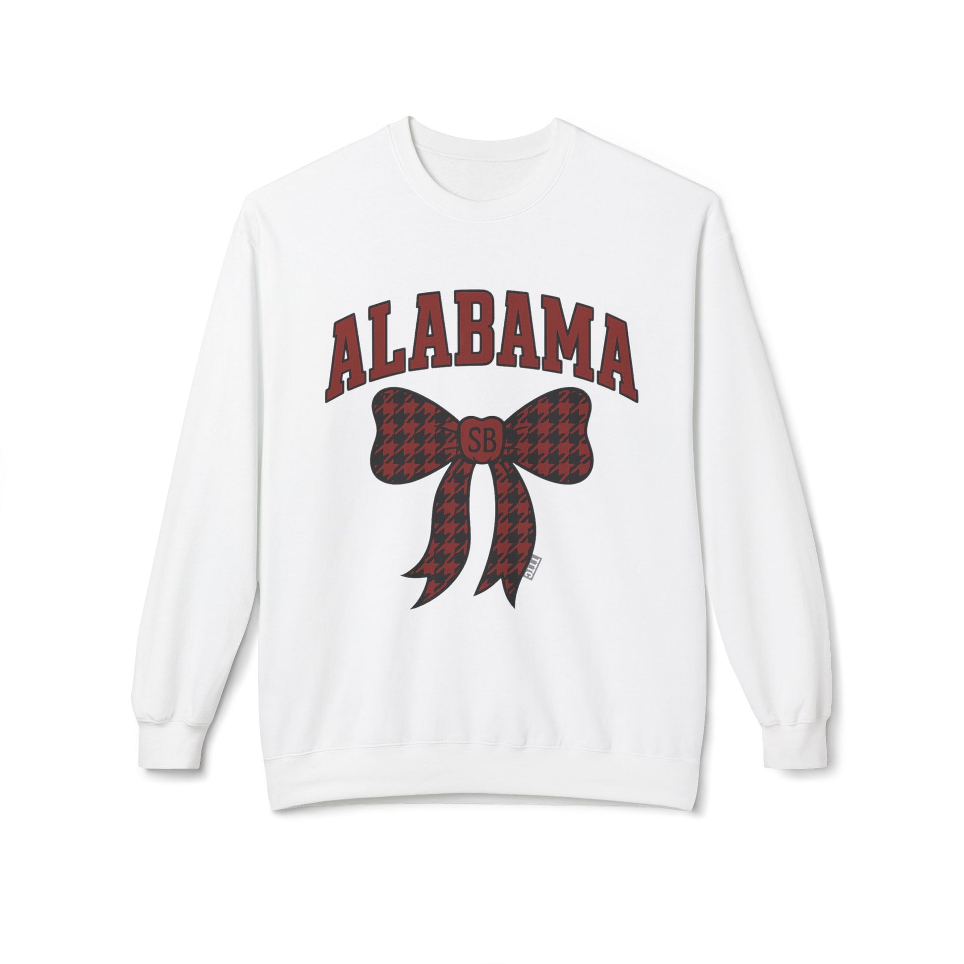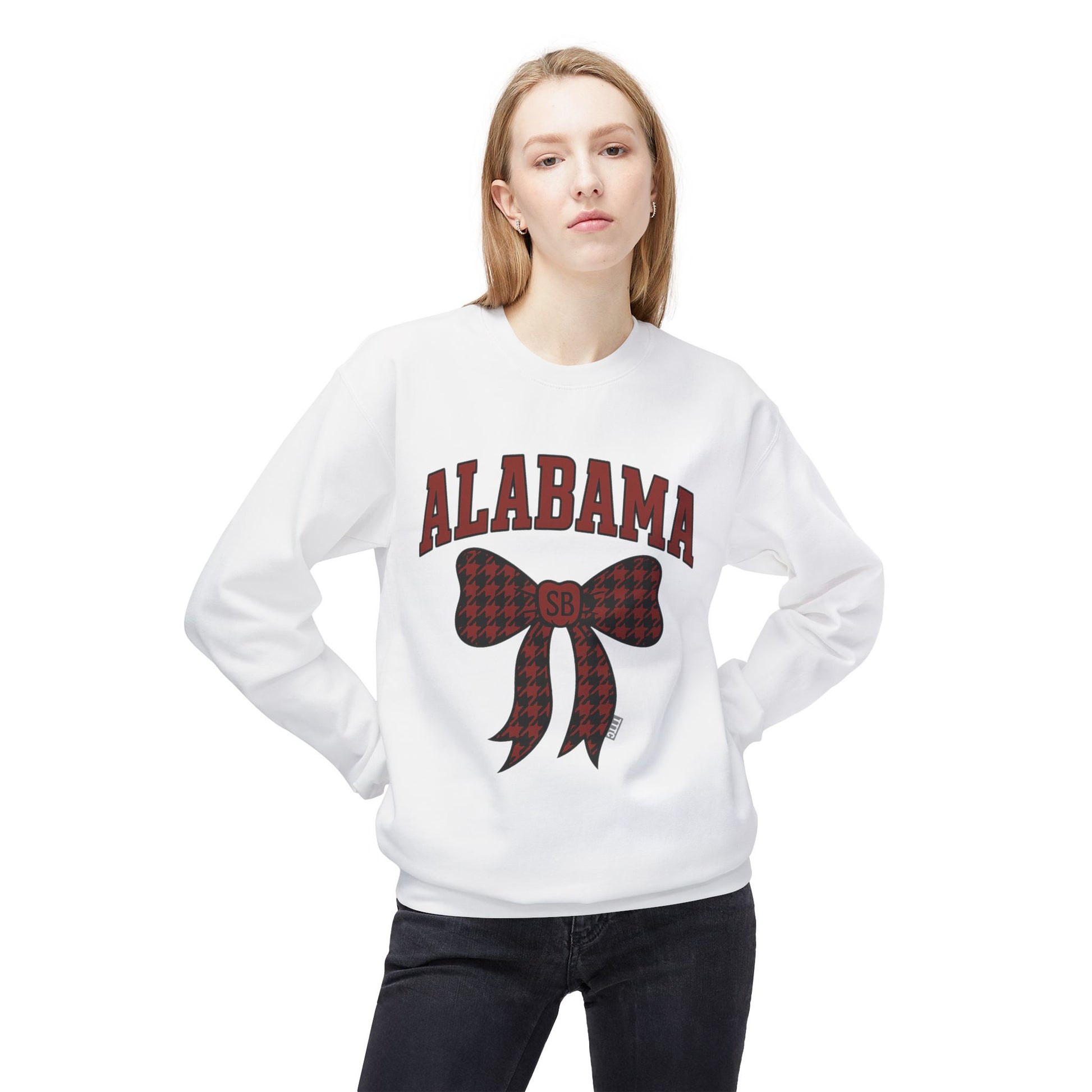 Featuring ALABAMA in striking crimson collegiate lettering and a standout bow detailed with a spin on the classic hounds tooth pattern, this design celebrates Saturdays in the South while keeping it stylish. The “SB” monogram on the bow knot and subtle TTTC brand tag lock in Southern Break’s identity, making this more than just another gameday sweatshirt – it’s a statement piece.