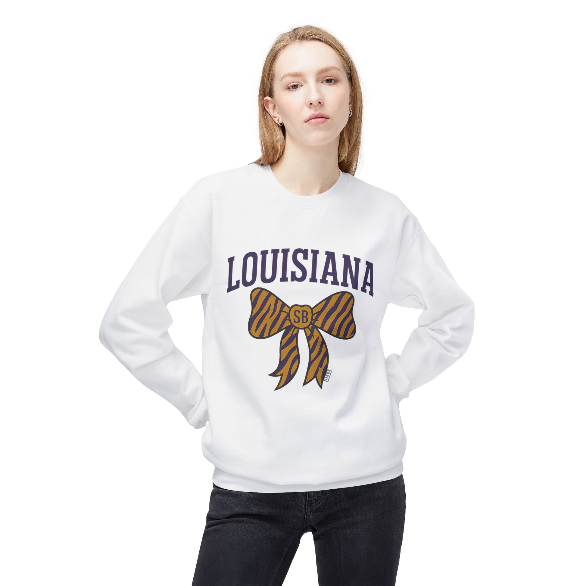 Featuring LOUISIANA in striking purple collegiate lettering and a standout bow detailed with a tiger stripe pattern, this design celebrates Saturdays in the South while keeping it stylish. The “SB” monogram on the bow knot and subtle TTTC brand tag lock in Southern Break’s identity, making this more than just another gameday sweatshirt – it’s a statement piece.