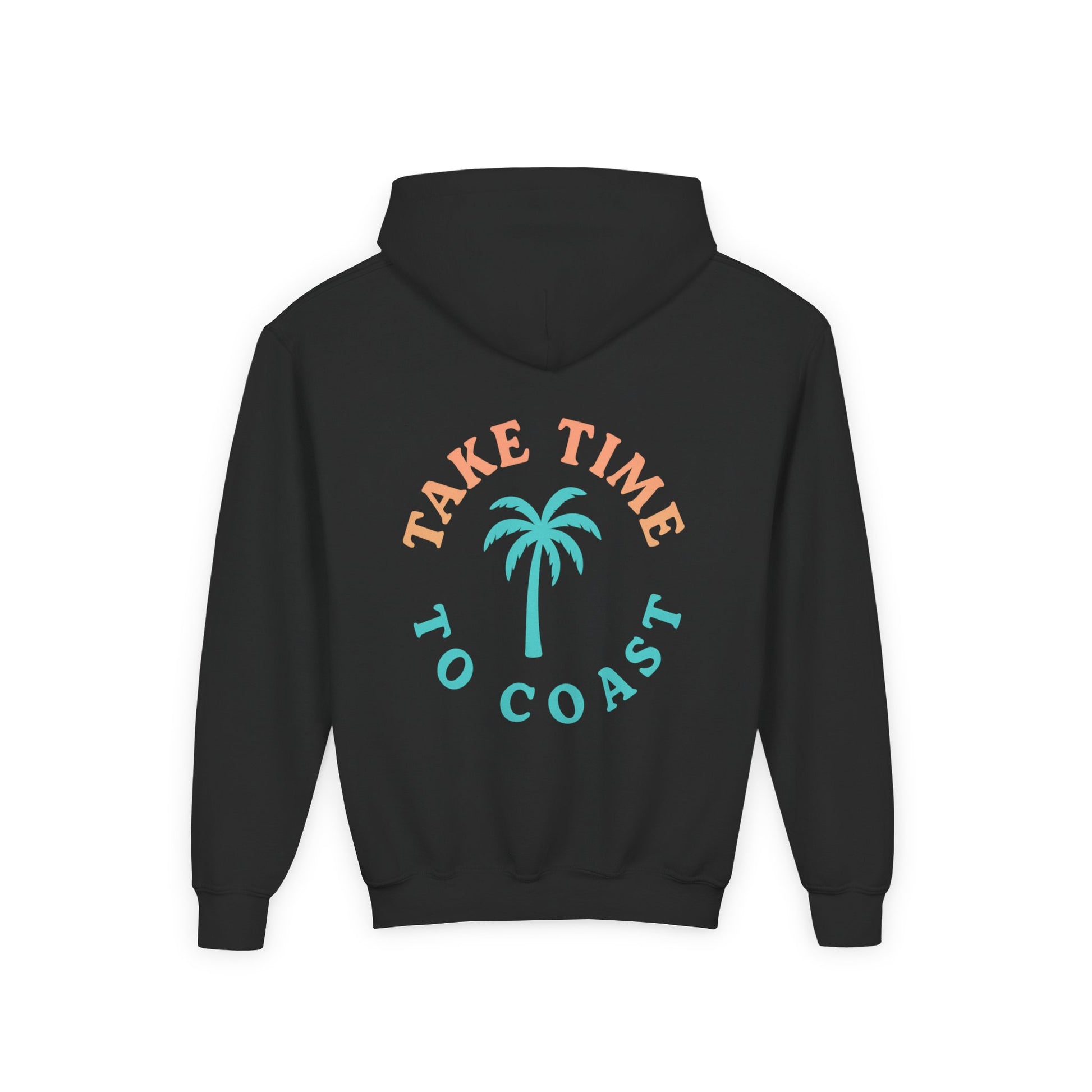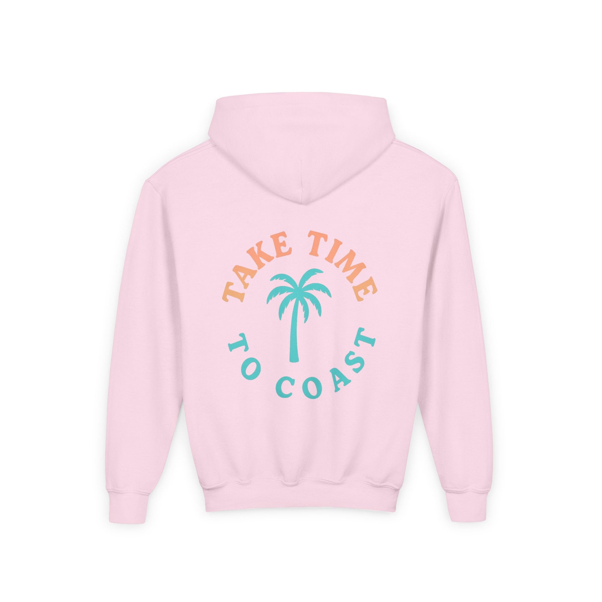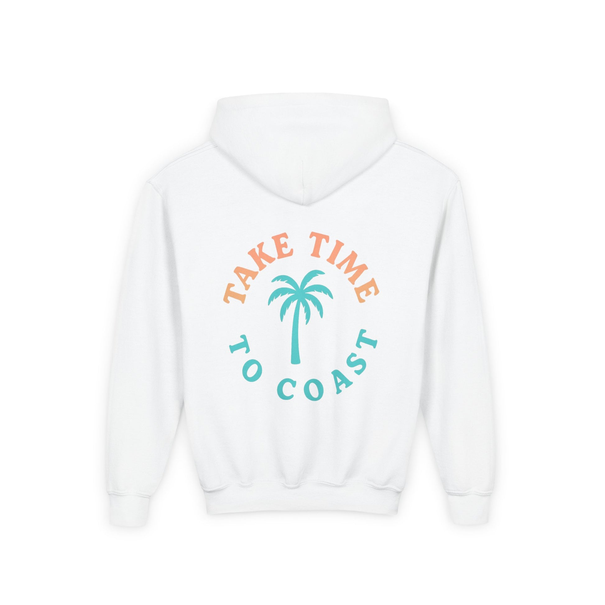 From the mat to the shore, this hoodie is made for the ones who never stop cheering. Featuring our Cheer Collection logo on the front — with a wave, palm, bow, and a flyer mid-back handspring — and the circular “Take Time to Coast” palm tree design on the back, it blends team pride with that signature Southern Break coastal vibe.