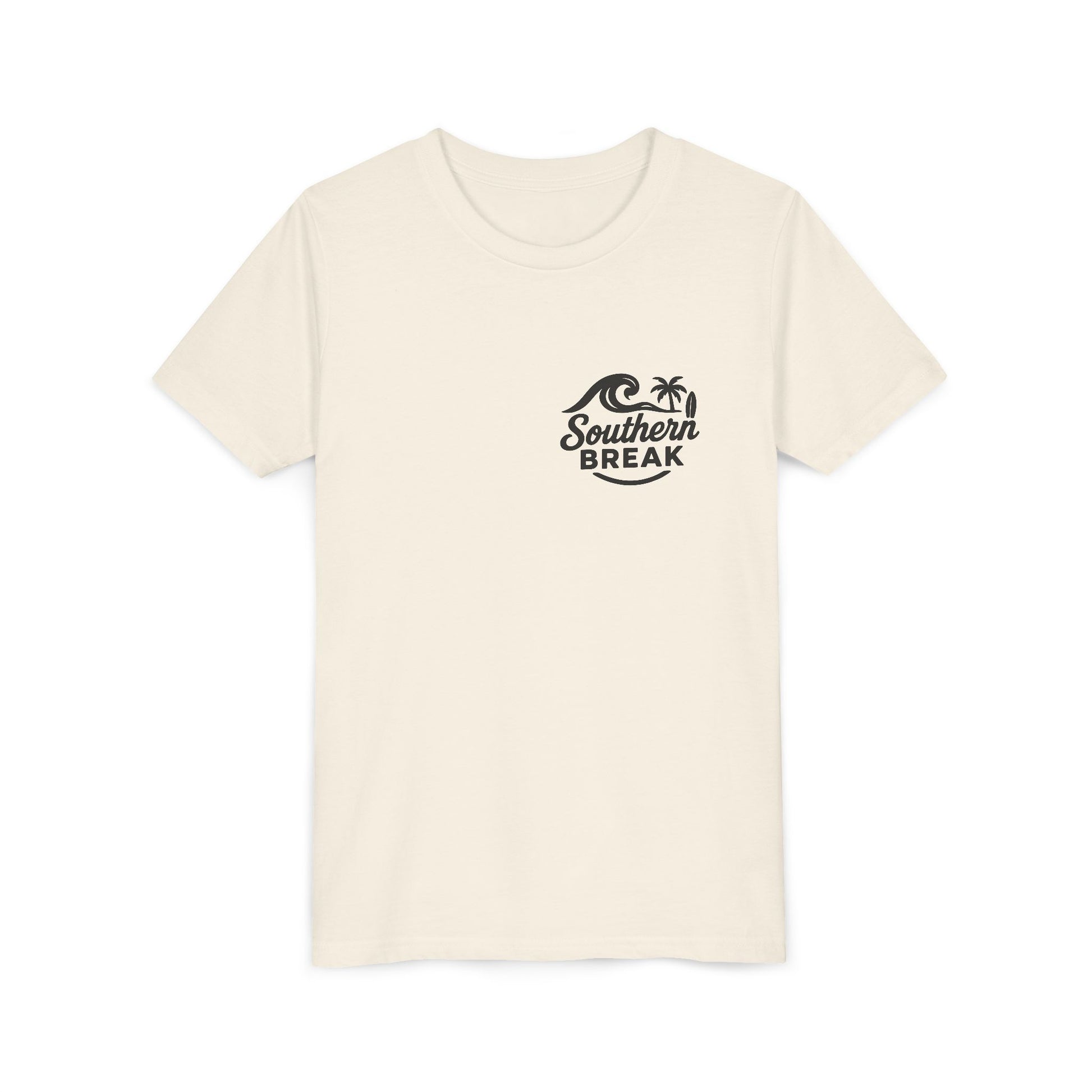 Set against a retro beach backdrop with a palm tree, surfboard, and golden horizon, this tee is a reminder to chase waves, live slow, and never forget where you came from.